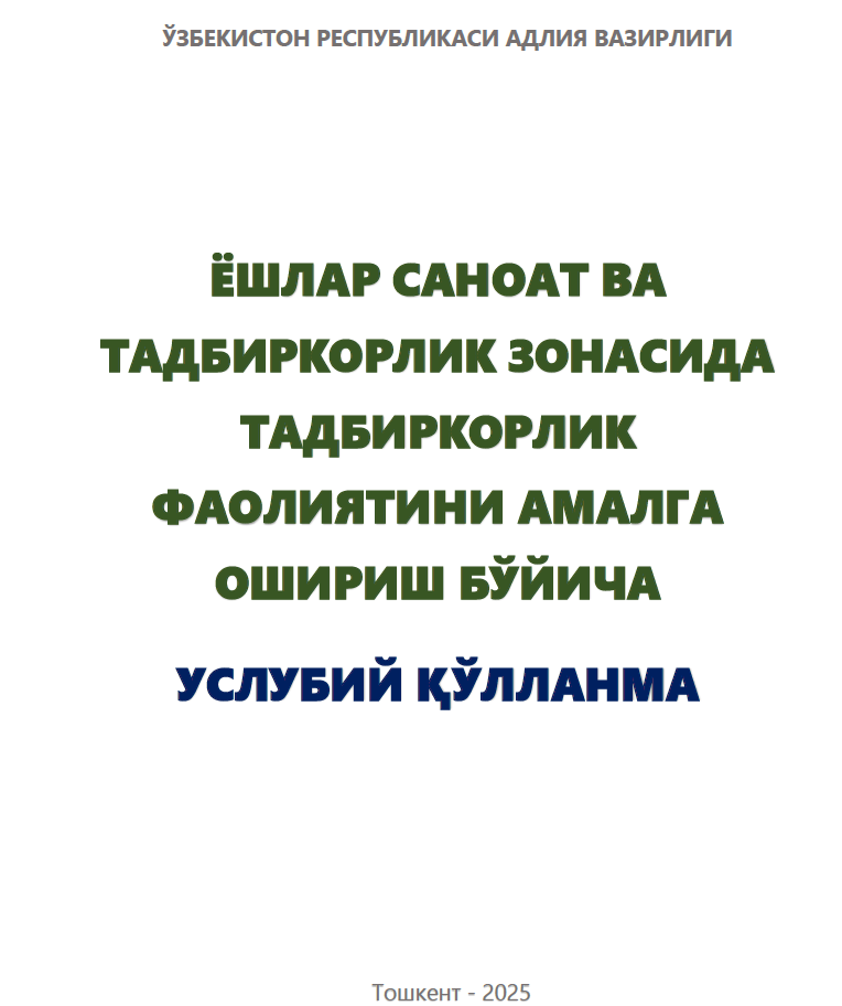 Ushbu uslubiy qoʻllanma tadbirkorlik faoliyatini boshlashdan uni tugatishgacha boʻlgan barcha harakatlarning huquqiy asoslari hamda uni amalga...